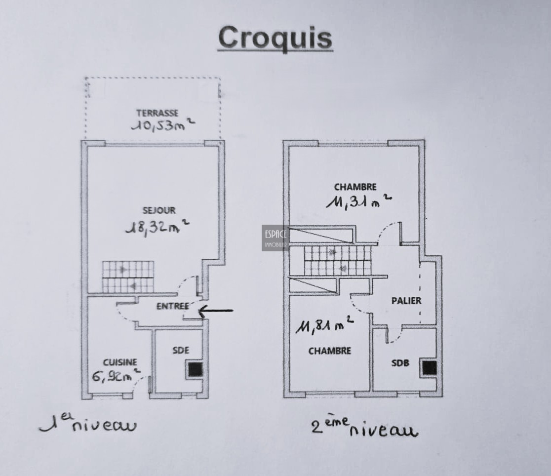Un aménagement parfait avec au premier niveau un grand salon avec double vitrage et terrasse de 11m2 offrant une magnifique vue mer, une grande cuisine séparée, une salle de douche avec wc puis au second niveau une grande chambre de 12m2 avec vue mer, une autre belle chambre de 11m2 vue montagne, une salle de bains avec wc, un couloir avec un grand placard.